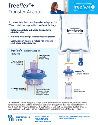 From simple needleless drug additions using a Luer lock syringe to adding 20 mm vials with the single-use freeflex®+ Transfer Adapter, Fresenius Kabi reconstitution and admixture technologies can help minimize the complexity for pharmacy to compound medications and help make it possible for nursing to admix when needed.